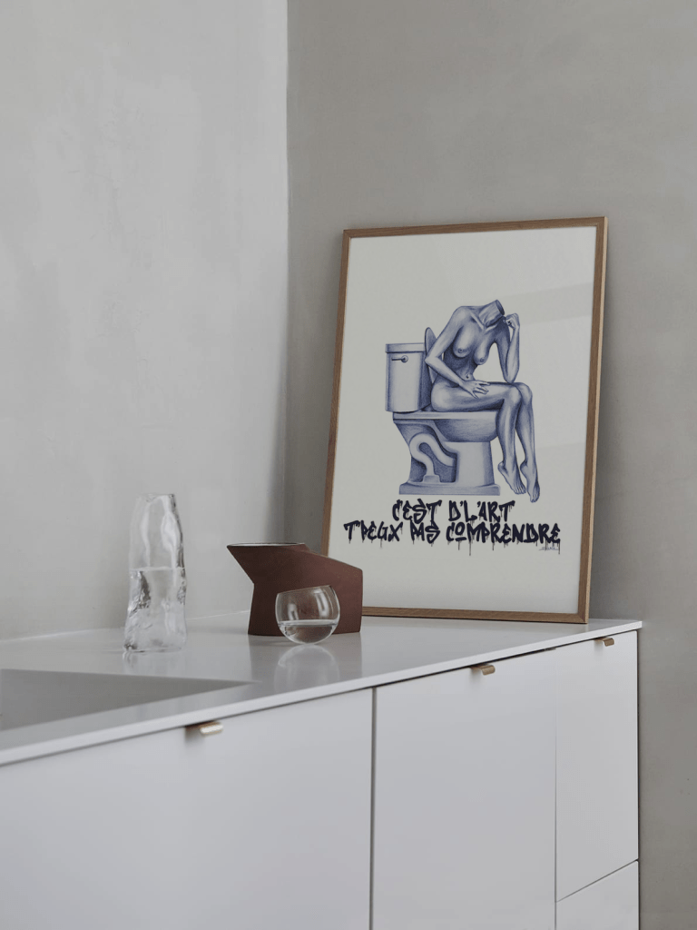 “La Penseuse” is a contemporary reinterpretation of “The Thinker” by Auguste Rodin. In Rodin’s sculpture the figure depicted is a man, traditionally seen as a symbol of power and intellectualism. By reinterpreting this iconic image with a headless female figure sitting on a toilet, the work points to the ways in which society has traditionally limited women’s representation in art and intellectualism.