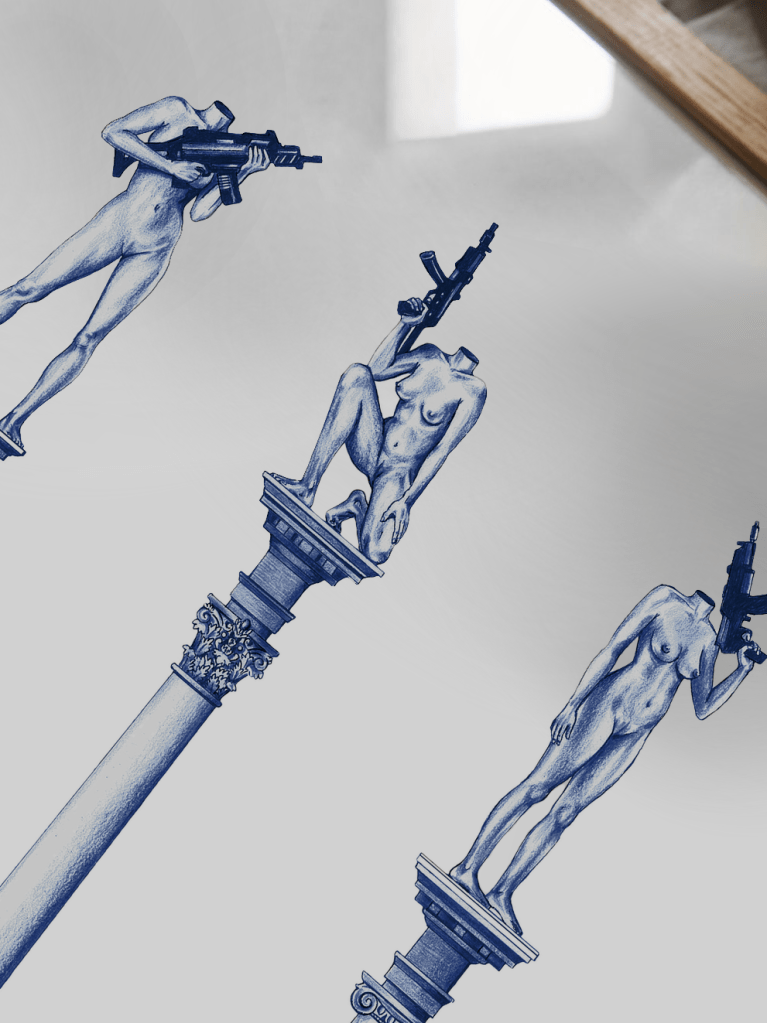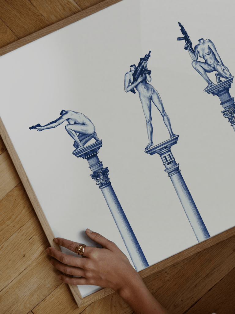 “Nouvelle Cariatides” (New Caryatids) a reinterpretation of the traditional Caryatids is an unframed A3 size (29.7 x 42 cm / 11.7 x 16.5 inches) Art Print, printed on Fine Art Photo Rag 300gsm paper. ‘Nouvelle Cariatides’ is an edition of 50, each signed and numbered by the artist.