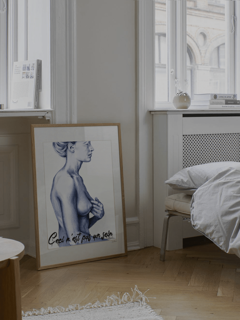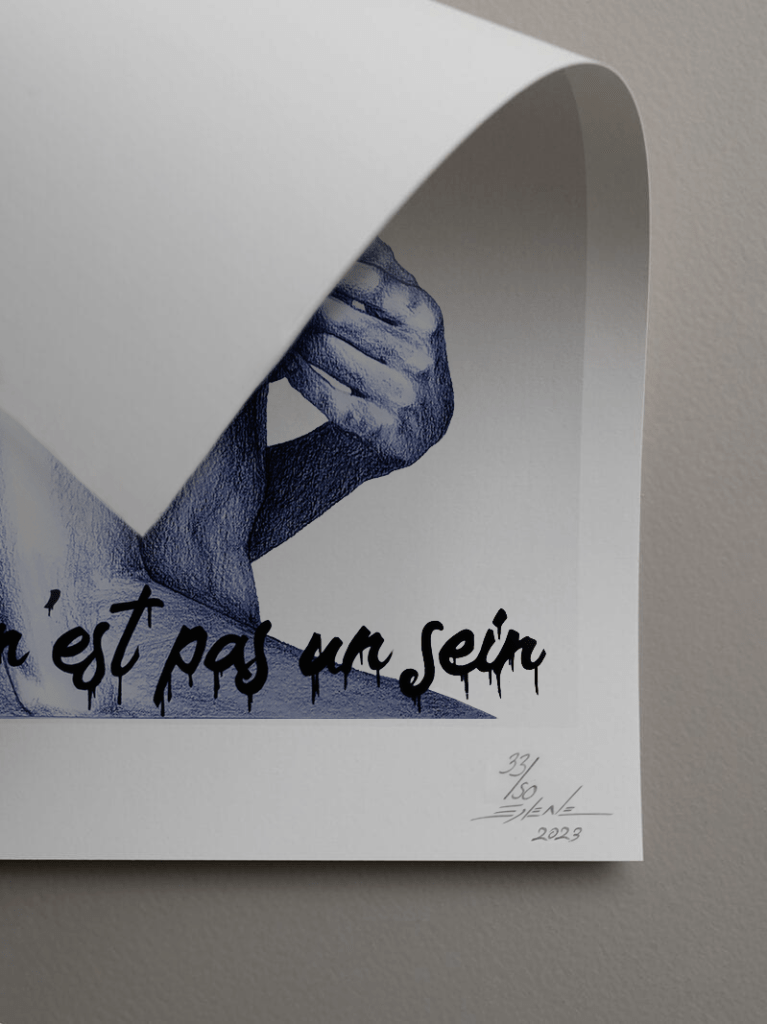 The work declares “Ceci n’est pas un sein” (This is not a breast) in reference to René Magritte’s “La Trahison des Images” (The Treachery of Images), a work famous for challenging the viewer’s perception of reality. Similarly, this work challenges what is considered “appropriate” online. It denounces gender politics regarding the censorship of female nipples which masquerades itself as a policy for protection and decency.